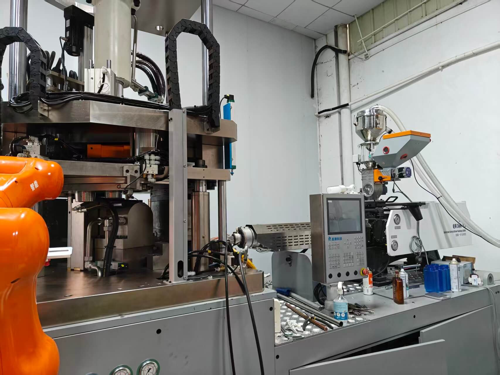18TONAutomatic PET& PP&PVC Bottle Blowing Machine with extrusion. --PET.PS ,PVC different raw material .